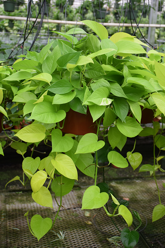 Other Names: Devil's Ivy, Scindapsus aureus Description: A climbing vine with luminous chartreuse-yellow heart shaped leaves; excellent for use in hanging pots, or cascading from windowsills Features & Attributes Neon Pothos' attractive heart-shaped leaves remain chartreuse in color with showy yellow variegation throughout the year on a plant with a spreading habit of growth. This is an herbaceous evergreen houseplant with a spreading, ground-hugging habit of growth. This plant can be pruned at any time to keep it looking its best. Planting & Growing When grown indoors, Neon Pothos can be expected to grow to be about 5 feet tall at maturity, with a spread of 24 inches. It grows at a fast rate, and under ideal conditions can be expected to live for approximately 10 years. This houseplant performs well in both bright or indirect sunlight and strong artificial light, and can therefore be situated in almost any well-lit room or location. It does best in average to evenly moist soil, but will not tolerate standing water. The surface of the soil shouldn't be allowed to dry out completely, and so you should expect to water this plant once and possibly even twice each week. Be aware that your particular watering schedule may vary depending on its location in the room, the pot size, plant size and other conditions; if in doubt, ask one of our experts in the store for advice. It is not particular as to soil type or pH; an average potting soil should work just fine. Be warned that parts of this plant are known to be toxic to humans and animals, so special care should be exercised if growing it around children and pets. There are many factors that will affect the ultimate height, spread and overall performance of a plant when grown indoors; among them, the size of the pot it's growing in, the amount of light it receives, watering frequency, the pruning regimen and repotting schedule. Use the information described here as a guideline only; individual performance can and will vary. Please contact the store to speak with one of our experts if you are interested in further details concerning recommendations on pot size, watering, pruning, repotting, etc. -- THIS IS A HOUSEPLANT AND IS NOT MEANT TO SURVIVE THE WINTER OUTDOORS IN OUR CLIMATE --