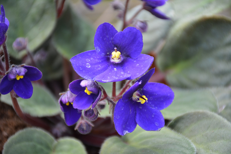 African Violet, Hybrid Blue features dainty clusters of blue round flowers with yellow eyes held atop the stems from late winter to late fall. Its glossy round leaves emerge light green, turning green in color throughout the year. The red stems can be quite attractive and add to the plant's interest.