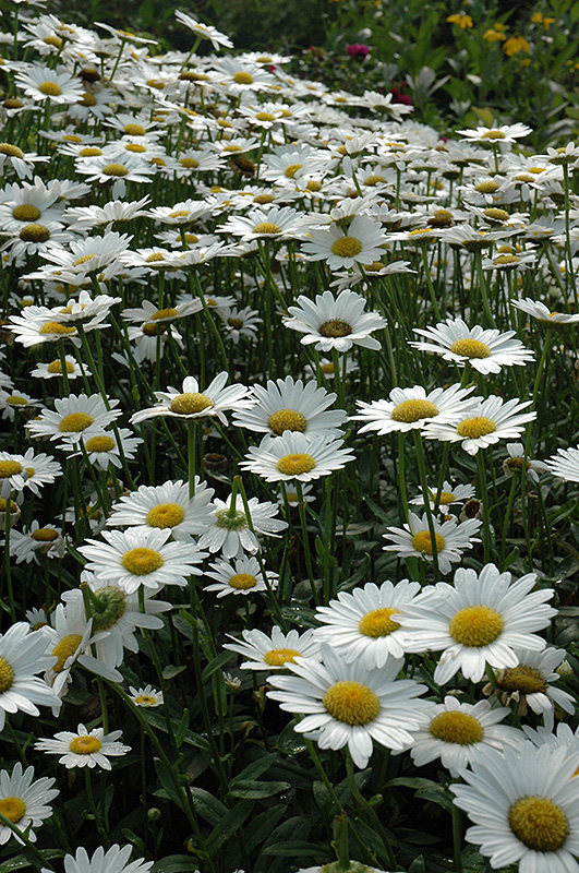 Hardiness Zone: 3b Ornamental Features Leucanthemum, Becky Shasta Daisy has masses of beautiful white daisy flowers with yellow eyes at the ends of the stems from early to late summer, which are most effective when planted in groupings. The flowers are excellent for cutting. Its serrated narrow leaves remain dark green in color throughout the season. Landscape Attributes Leucanthemum, Becky Shasta Daisy is an herbaceous perennial with a mounded form. Its relatively fine texture sets it apart from other garden plants with less refined foliage. This plant will require occasional maintenance and upkeep, and should be cut back in late fall in preparation for winter. It is a good choice for attracting butterflies to your yard. Gardeners should be aware of the following characteristic(s) that may warrant special consideration; Leucanthemum, Becky Shasta Daisy is recommended for the following landscape applications; Planting & Growing Leucanthemum, Becky Shasta Daisy will grow to be about 24 inches tall at maturity extending to 3 feet tall with the flowers, with a spread of 24 inches. When grown in masses or used as a bedding plant, individual plants should be spaced approximately 20 inches apart. The flower stalks can be weak and so it may require staking in exposed sites or excessively rich soils. It grows at a fast rate, and under ideal conditions can be expected to live for approximately 5 years. As an herbaceous perennial, this plant will usually die back to the crown each winter, and will regrow from the base each spring. Be careful not to disturb the crown in late winter when it may not be readily seen! This plant does best in full sun to partial shade. It does best in average to evenly moist conditions, but will not tolerate standing water. To help this plant achive its best flowering performance, periodically apply a flower-boosting fertilizer from early spring through into the active growing season. It is not particular as to soil type or pH. It is highly tolerant of urban pollution and will even thrive in inner city environments. This particular variety is an interspecific hybrid. It can be propagated by division; however, as a cultivated variety, be aware that it may be subject to certain restrictions or prohibitions on propagation. Leucanthemum, Becky Shasta Daisy is a fine choice for the garden, but it is also a good selection for planting in outdoor pots and containers. Because of its height, it is often used as a 'thriller' in the 'spiller-thriller-filler' container combination; plant it near the center of the pot, surrounded by smaller plants and those that spill over the edges. It is even sizeable enough that it can be grown alone in a suitable container. Note that when growing plants in outdoor containers and baskets, they may require more frequent waterings than they would in the yard or garden.![]()