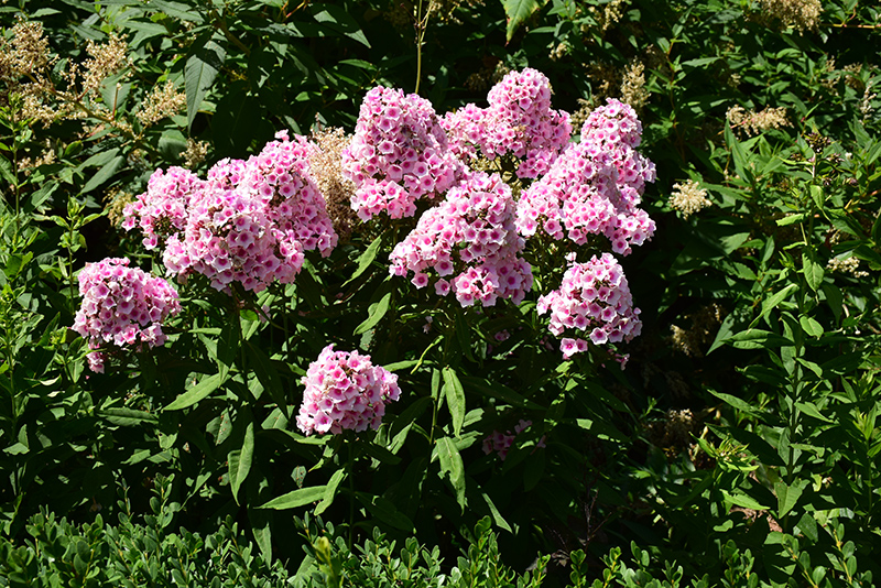 Phlox, (Garden) Bright Eyes features bold fragrant conical shell pink star-shaped flowers with rose eyes at the ends of the stems from early summer to early fall. The flowers are excellent for cutting. Its narrow leaves remain green in color throughout the season.