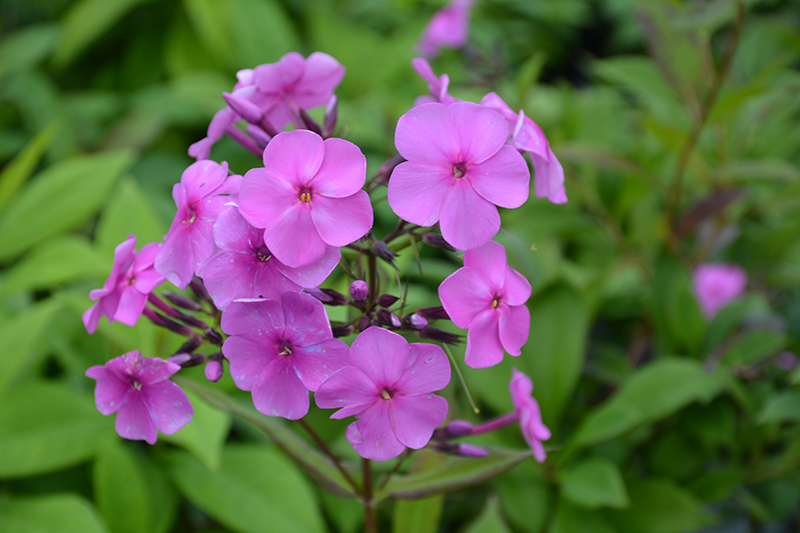 Phlox, (Garden) Super Ka-Pow Pink features bold fragrant conical pink star-shaped flowers with hot pink eyes at the ends of the stems from late spring to late summer. The flowers are excellent for cutting. Its narrow leaves remain green in color throughout the season.