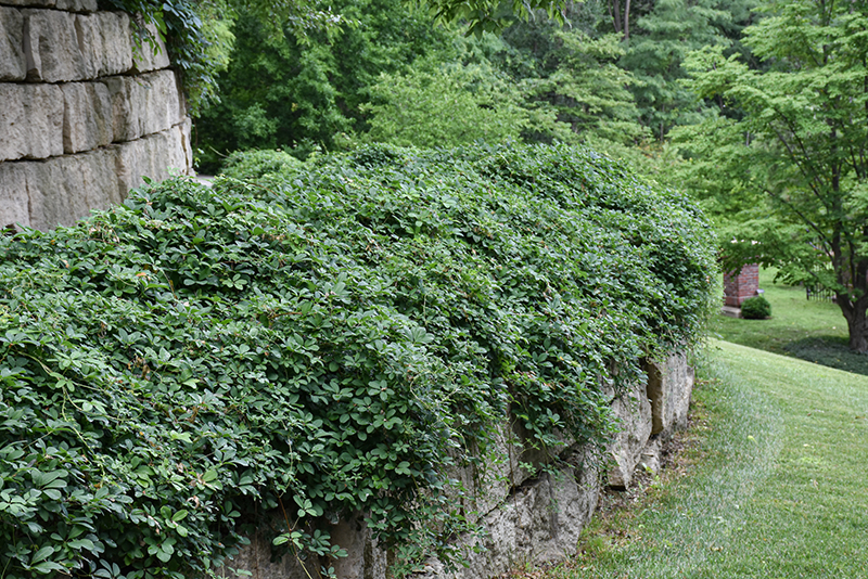 Akebia, Fiveleaf will grow to be about 30 feet tall at maturity, with a spread of 24 inches. As a climbing vine, it tends to be leggy near the base and should be underplanted with low-growing facer plants. It should be planted near a fence, trellis or other landscape structure where it can be trained to grow upwards on it, or allowed to trail off a retaining wall or slope. It grows at a fast rate, and under ideal conditions can be expected to live for approximately 20 years.