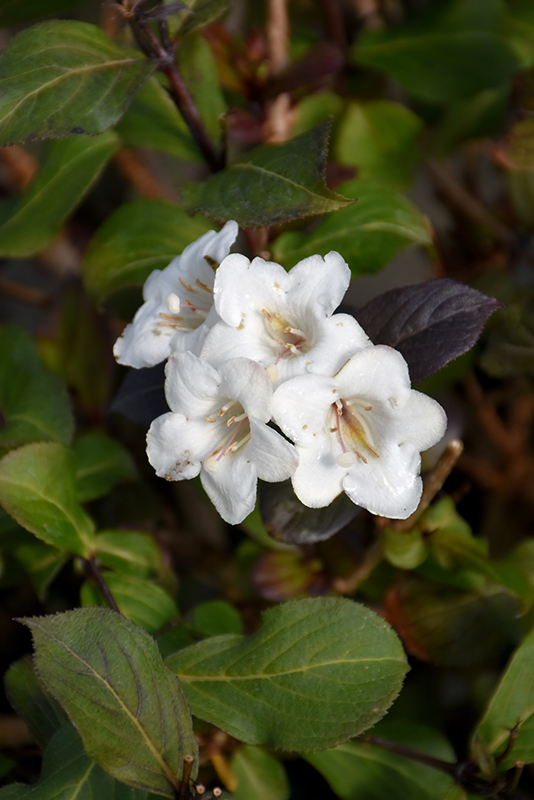 Hardiness Zone: 4a Brand: Proven Winners Description: An elegant selection, featuring green-white trumpet flowers held over dramatic dark foliage in late spring; attracts hummingbirds; a relatively compact shrub, ideal for garden detail use; Ornamental Features Weigela, Wine & Spirits features showy clusters of white trumpet-shaped flowers along the branches from late spring to early summer, which emerge from distinctive light green flower buds. It has attractive burgundy-variegated dark green foliage. The pointy leaves are highly ornamental and turn an outstanding deep purple in the fall. The smooth gray bark and dark red branches add an interesting dimension to the landscape. Landscape Attributes Weigela, Wine & Spirits is a multi-stemmed deciduous shrub with an upright spreading habit of growth. Its average texture blends into the landscape, but can be balanced by one or two finer or coarser trees or shrubs for an effective composition. This shrub will require occasional maintenance and upkeep, and should only be pruned after flowering to avoid removing any of the current season's flowers. It is a good choice for attracting hummingbirds to your yard. It has no significant negative characteristics. Weigela, Wine & Spirits is recommended for the following landscape applications; Planting & Growing Weigela, Wine & Spirits will grow to be about 5 feet tall at maturity, with a spread of 5 feet. It tends to fill out right to the ground and therefore doesn't necessarily require facer plants in front, and is suitable for planting under power lines. It grows at a medium rate, and under ideal conditions can be expected to live for approximately 30 years. This shrub does best in full sun to partial shade. It prefers to grow in average to moist conditions, and shouldn't be allowed to dry out. To help this plant achive its best flowering performance, periodically apply a flower-boosting fertilizer from early spring through into the active growing season. It is not particular as to soil type or pH. It is highly tolerant of urban pollution and will even thrive in inner city environments. This is a selected variety of a species not originally from North America.![]()