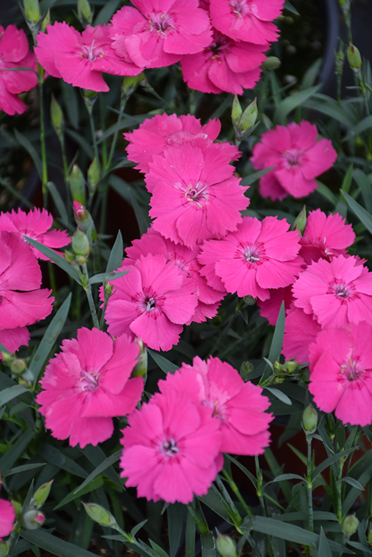 Hardiness Zone: 3a Other Names: Border Pinks, Cheddar Pinks Brand: Dummen Orange Description: An upright, mounding selection presenting vivid magenta pink flowers above attractive blue-green foliage; great for flower arrangements; deadhead to rebloom; pair up with summer blooming perennials and annuals to time a continued flower display Ornamental Features Dianthus, Mad Magenta Pinks is smothered in stunning fragrant hot pink frilly flowers at the ends of the stems from late spring to late summer. The flowers are excellent for cutting. Its attractive narrow leaves remain grayish green in color with hints of silvery blue throughout the year. Landscape Attributes Dianthus, Mad Magenta Pinks is an herbaceous evergreen perennial with a mounded form. It brings an extremely fine and delicate texture to the garden composition and should be used to full effect. This is a relatively low maintenance plant, and is best cleaned up in early spring before it resumes active growth for the season. It is a good choice for attracting bees and butterflies to your yard, but is not particularly attractive to deer who tend to leave it alone in favor of tastier treats. It has no significant negative characteristics. Dianthus, Mad Magenta Pinks is recommended for the following landscape applications; Planting & Growing Dianthus, Mad Magenta Pinks will grow to be only 6 inches tall at maturity extending to 8 inches tall with the flowers, with a spread of 12 inches. When grown in masses or used as a bedding plant, individual plants should be spaced approximately 10 inches apart. Its foliage tends to remain low and dense right to the ground. It grows at a medium rate, and under ideal conditions can be expected to live for approximately 10 years. As an evegreen perennial, this plant will typically keep its form and foliage year-round. This plant does best in full sun to partial shade. It does best in average conditions that are neither too wet nor too dry. To help this plant achive its best flowering performance, periodically apply a flower-boosting fertilizer from early spring through into the active growing season. It is not particular as to soil type or pH. It is highly tolerant of urban pollution and will even thrive in inner city environments. This particular variety is an interspecific hybrid. It can be propagated by division; however, as a cultivated variety, be aware that it may be subject to certain restrictions or prohibitions on propagation. Dianthus, Mad Magenta Pinks is a fine choice for the garden, but it is also a good selection for planting in outdoor pots and containers. It is often used as a 'filler' in the 'spiller-thriller-filler' container combination, providing a mass of flowers and foliage against which the thriller plants stand out. Note that when growing plants in outdoor containers and baskets, they may require more frequent waterings than they would in the yard or garden.![]()