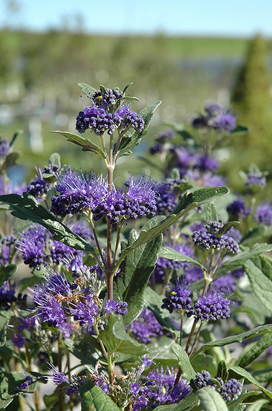 Hardiness Zone: 6a Other Names: Bluebeard, Blue Spirea, Blue Mist Shrub Description: Light, airy shrub with deep blue flowers on dusty green leaves; foliage has fuzzy, silver undersides and is pleasantly fragrant when crushed; a real butterfly magnet for the garden Ornamental Features Bluebeard, Dark Knight features dainty cymes of royal blue flowers along the branches from mid summer to early fall. The flowers are excellent for cutting. It has grayish green foliage with silver undersides. The fuzzy oval leaves do not develop any appreciable fall color. Landscape Attributes Bluebeard, Dark Knight is an open multi-stemmed deciduous shrub with an upright spreading habit of growth. Its relatively fine texture sets it apart from other landscape plants with less refined foliage. This is a relatively low maintenance shrub, and is best pruned in late winter once the threat of extreme cold has passed. It is a good choice for attracting birds and butterflies to your yard, but is not particularly attractive to deer who tend to leave it alone in favor of tastier treats. It has no significant negative characteristics. Bluebeard, Dark Knight is recommended for the following landscape applications; Planting & Growing Bluebeard, Dark Knight will grow to be about 24 inches tall at maturity, with a spread of 24 inches. It tends to fill out right to the ground and therefore doesn't necessarily require facer plants in front. It grows at a medium rate, and under ideal conditions can be expected to live for approximately 20 years. This shrub does best in full sun to partial shade. It does best in average to evenly moist conditions, but will not tolerate standing water. This plant should be periodically fertilized throughout the active growing season with a specially-formulated acidic fertilizer. It is not particular as to soil type or pH. It is somewhat tolerant of urban pollution. This particular variety is an interspecific hybrid.![]()